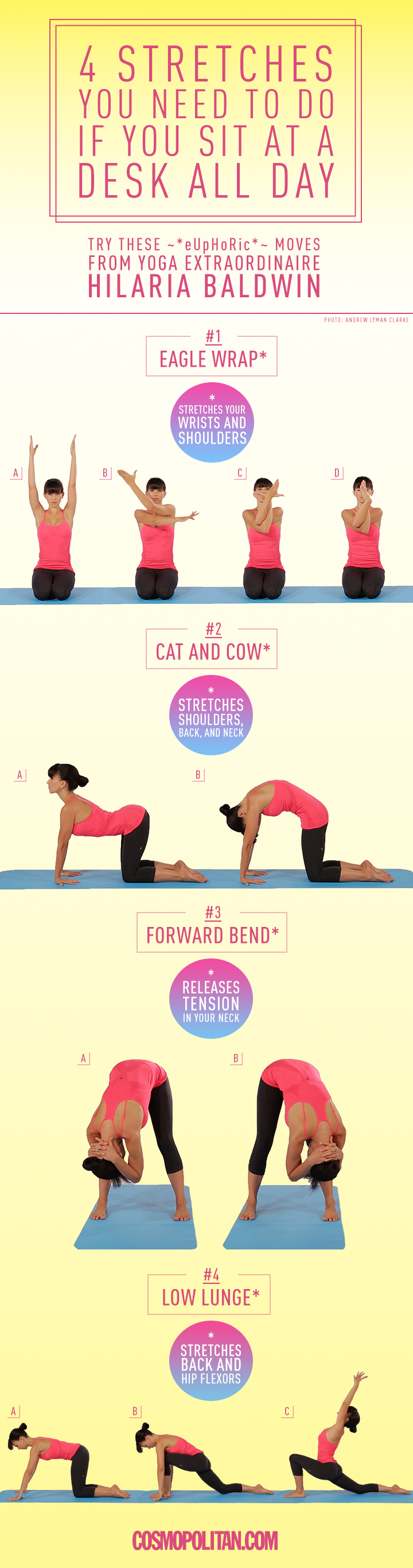 Everybody’s body is important, and just like it is important to exercise, stand more, and eat right, it’s also important to stretch. If a certain songstress was here she would add, “Don’t stop. Make it pop.” That’s why Cosmopolitan crafted the blog post titled, “Stretches You Need to Do if You Sit at a Desk All Day.” So get out your yoga mat because, it’s goen down. I’m getten’ limber! You better move, I gotta stretch.
